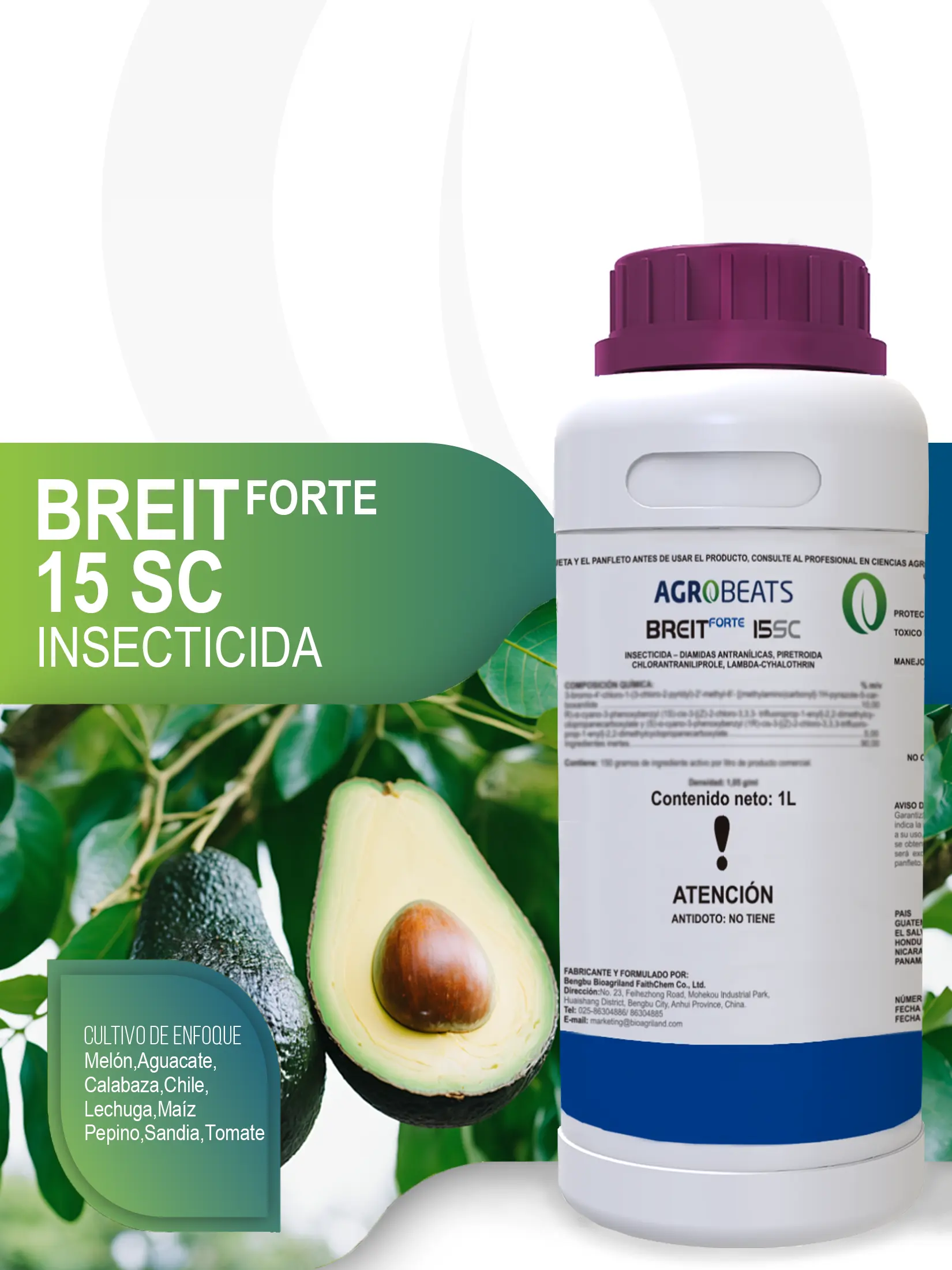 BREIT FORTE 15SC es un insecticida de amplio espectro, para uso vía foliar y con efecto residual, de rápida actividad. En el insecto muestra actividad estomacal y de contacto, afectando su sistema nervioso y deteniendo inmediatamente la alimentación. BREIT FORTE 15SC interviene en el proceso de contracción muscular de los insectos, ya que actúa como activador de los receptores de rianodina, esta activación estimula la liberación de calcio desde los músculos. Además, actúa sobre los canales de sodio del sistema nervioso central de los insectos, Por lo tanto, los insectos afectados dejan rápidamente de alimentarse y moverse hasta morir.
