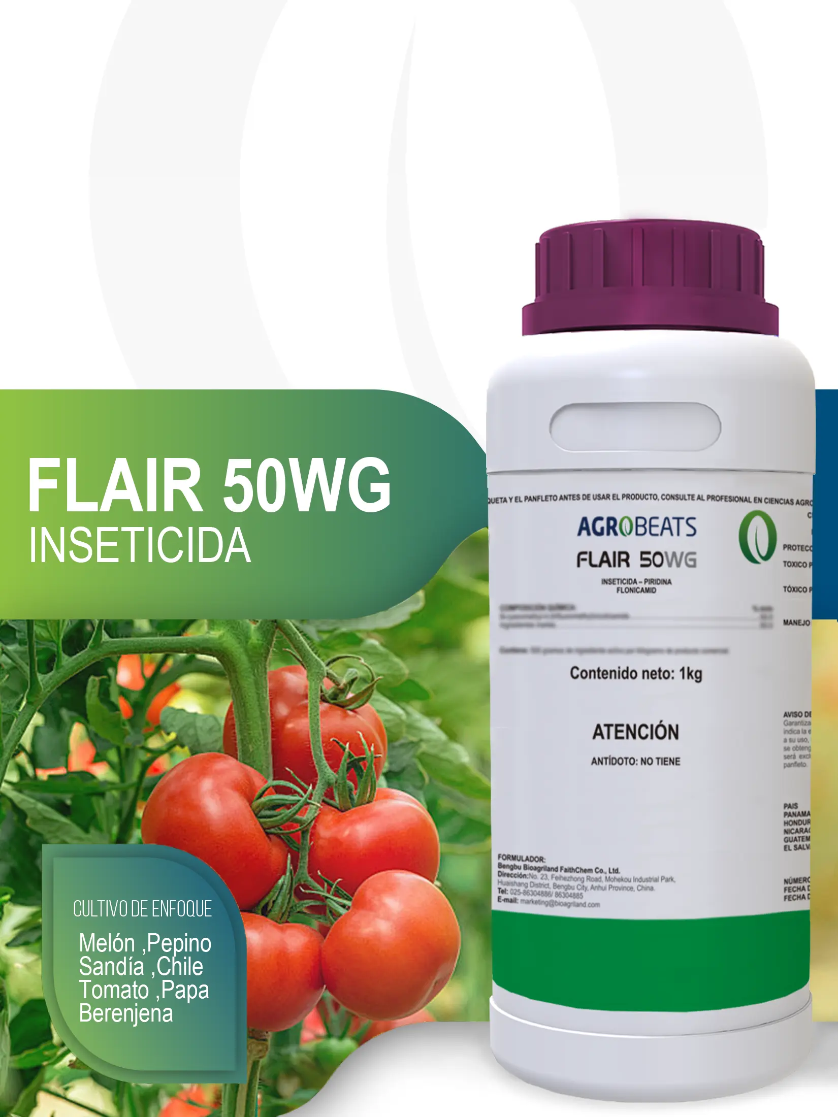 FLAIR 50WG es un insecticida que pertenece al grupo químico de las Piridinocarboxamidas. Tiene actividad translaminar en aplicación al follaje y actividad sistémica vía acropétala aplicado al suelo. Actúa por contacto e ingestión. Una vez que el producto entra en contacto con la plaga, ésta deja de alimentarse debido al efecto antialimentario.