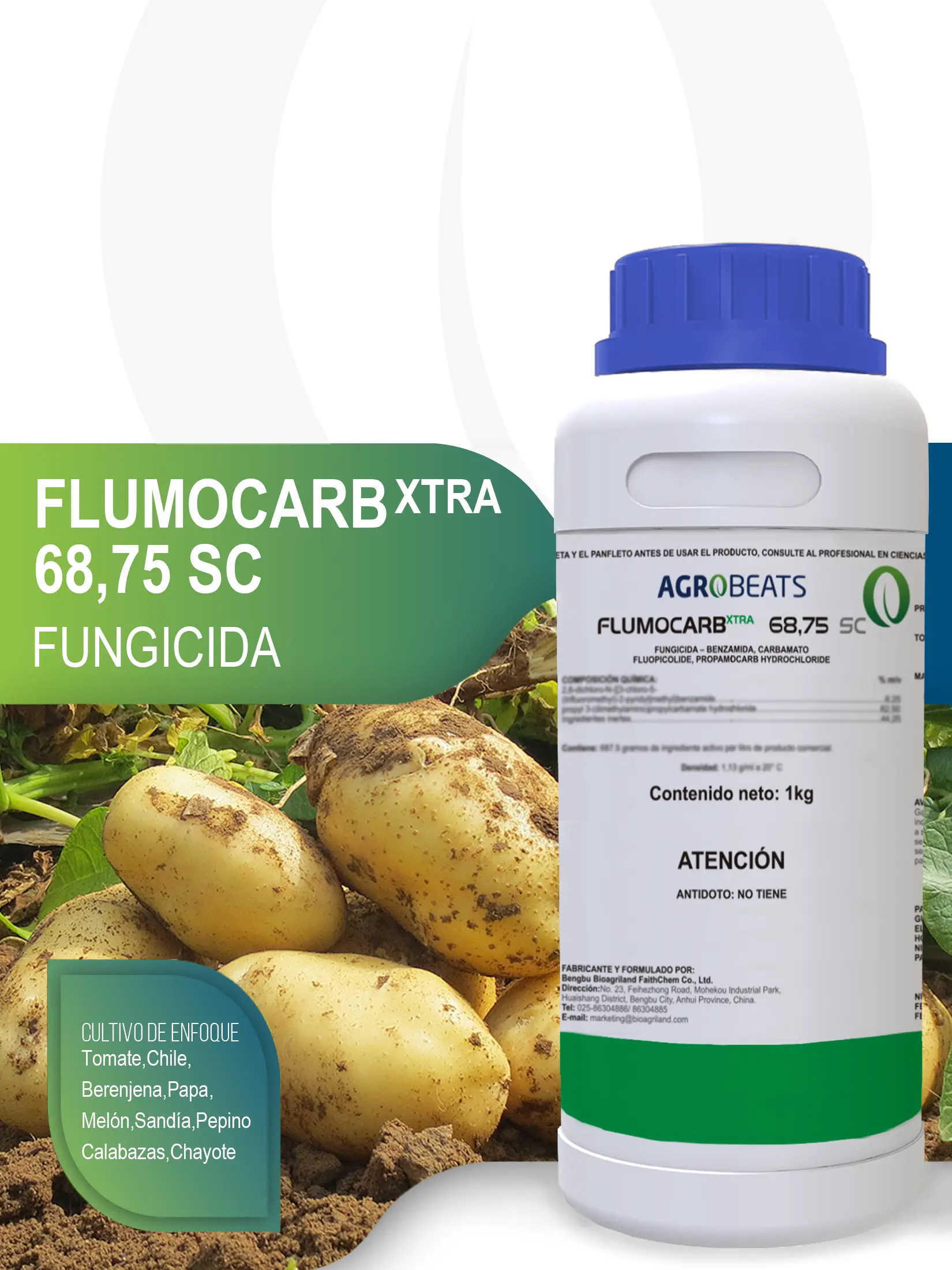 FLUMOCARB XTRA 68.75SC es un fungicida sistémico, translaminar, protectante, preventivo y curativo. Se absorbe a través del follaje y las raíces. Fluopicolida provoca la deslocalización de proteínas tipo espectrina causando desequilibrio entre la membrana plasmática y el citoesqueleto de los hongos. Propamocarb inhibe la síntesis de lípidos causando alteración en la formación de la pared celular de los hongos. Inhibe así el crecimiento del micelio, la producción y la germinación de las esporas.